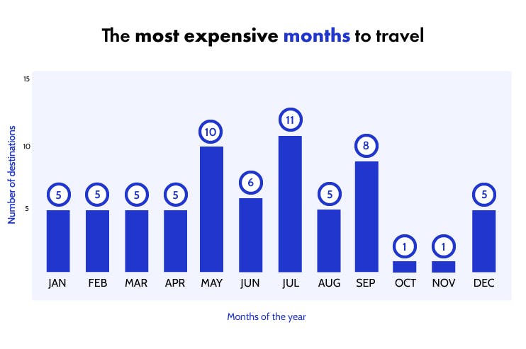 July is the most expensive month on average for a vacation. It is the priciest month to travel to eleven tourist attractions out of seventy on our list, including Dubrovnik, Tokyo, and Florence. The difference in price is astounding - for example, a night in a hotel in Oia, Santorini costs 496% more on average in July than in January!