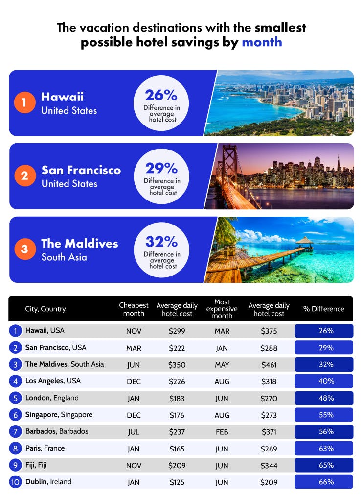 The Vacation Destinations with the Highest Possible Hotel Savings by Month
