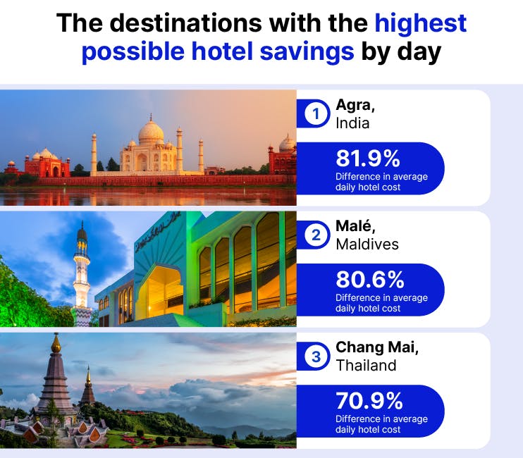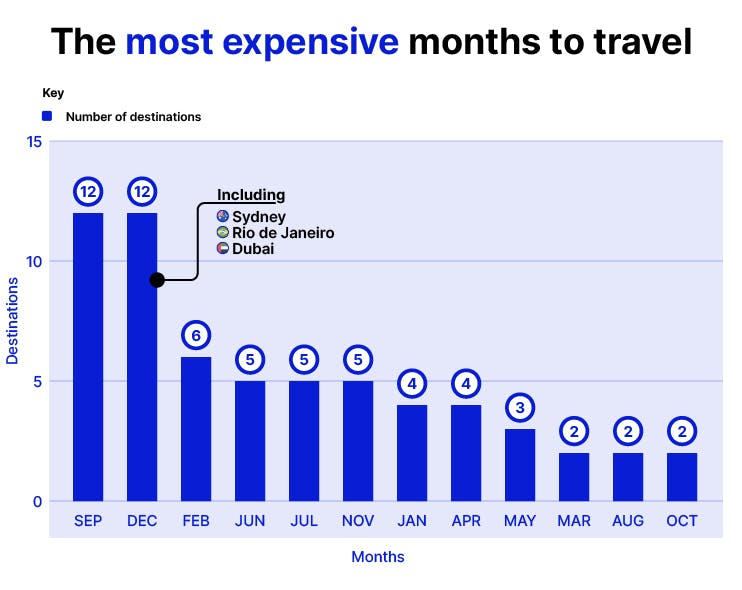 For example, September and December are the most expensive months in 12 destinations, more than any other month. December is the peak for Asian cities like Chiang Mai, Phuket, and Dubai, which are popular winter vacation spots.
