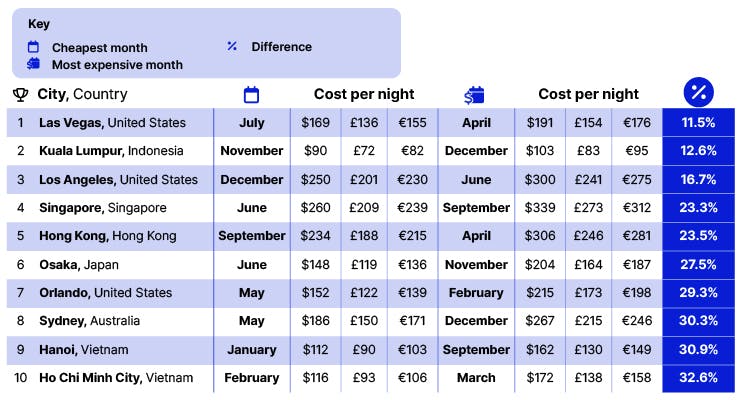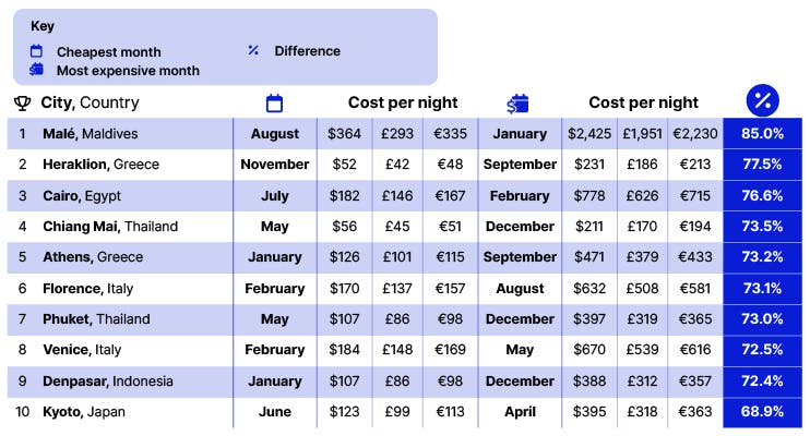 We’ve also examined which cities have the most significant differences between their most expensive month and their cheapest, offering the best potential savings.