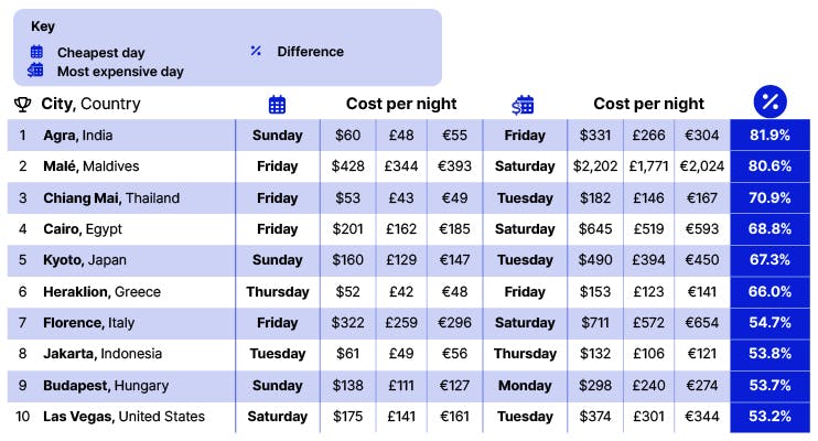 Using this information, we calculated the difference in average price between a nightly stay at a 3-star hotel in the cheapest and most expensive month of the year. We repeated this for days of the week.