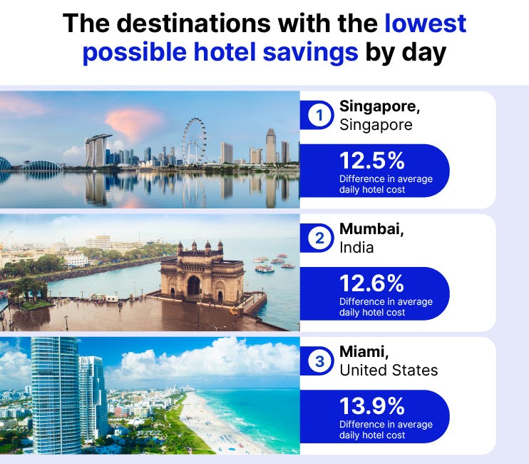 With a 12.5% drop in hotel prices from Sunday to Monday, Singapore shows the least variation among the listed cities. This stability could be due to Singapore's role as a central business hub and a popular year-round tourist destination. Its consistent pricing suggests a steady demand from business travelers and tourists, balancing out fluctuations that might be seen in more seasonally affected destinations.