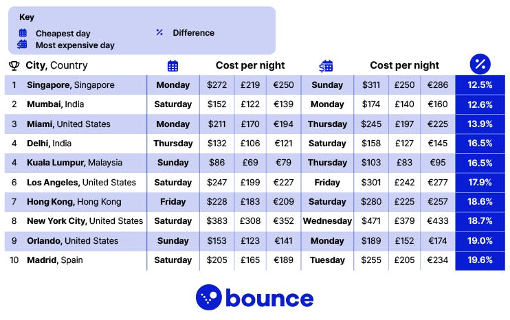Contrary to popular belief, the data shows that Saturday is the cheapest day to stay in 17 cities, including Las Vegas, Dublin, and Milan. This could be due to various factors, including lower demand for weekend business travel. This was also the most common cheapest day when we analyzed 2022.