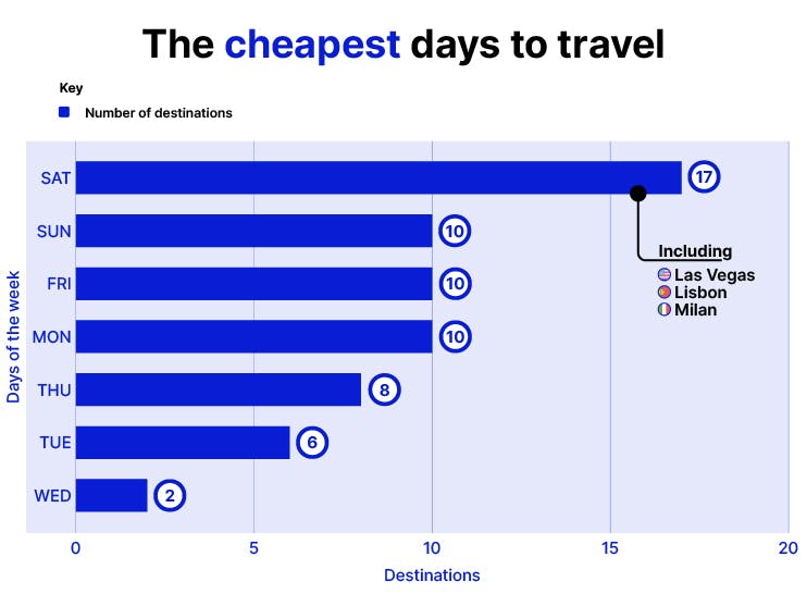 Three days, Sunday, Friday and Monday, are tied in second, with each being the cheapest day for 10 different cities. For example, Sunday is the cheapest day in Prague and Amsterdam, Friday is if you’re staying in Barcelona and Rome, and Monday is for Singapore and Miami.