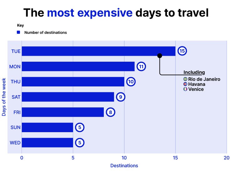 On the other hand, Tuesday is the most common day to be the most expensive. This was the case in 15 destinations worldwide, such as Madrid, London, and Paris. Again, this could be due to business travel.