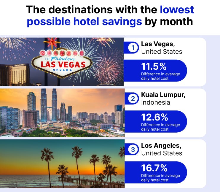 The capital city of Malaysia experiences a 12.6% decrease from December to November. Kuala Lumpur's tropical rainforest climate results in pretty consistent temperatures and weather patterns throughout the year, which could explain the minimal fluctuation in hotel pricing. Its blend of cultural attractions and modern amenities keeps the city attractive to tourists all year round.