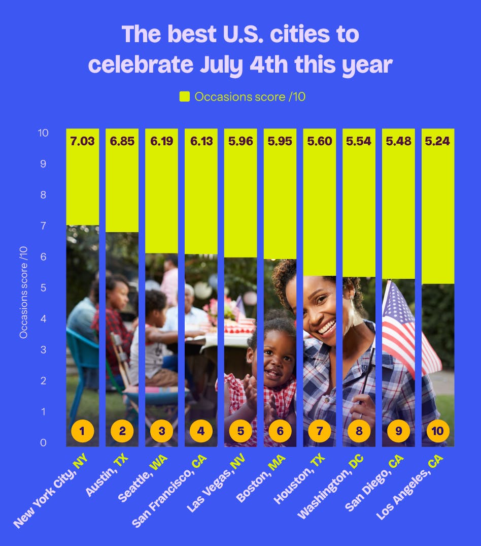 The home of the Big Apple is probably more affordable than you think, with the average price for a one-night stay at a three-star hotel costing $150. Over the last year, 37,860 articles praised New York City for its 4th of July events, a testament to the city’s favor during the party season. An article by Hudson Yards suggested many spots with stunning views to watch the fireworks, including The Edge bar, for skyscraper views and a DJ, and Verano, which offers an open bar from 7:30 - 9:30 pm and a fireworks view over the Hudson.