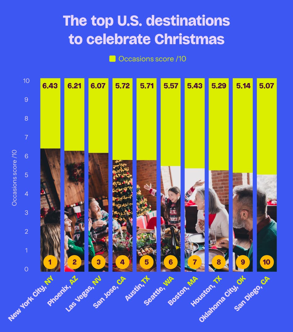 Phoenix stands out as a warm weather alternative for a Christmas getaway in 2025, a top choice for those seeking winter sunshine instead of snow. While Phoenix doesn’t match New York’s high search volumes, it still saw 2,220 Christmas-related searches (13 per 10,000 people). The city offers a comfortable travel experience, with a short 11-minute drive from the airport to downtown and average 3-star hotel rates around $204 per night.