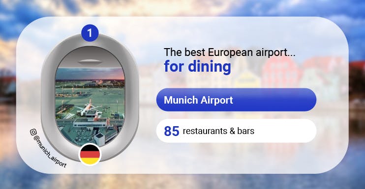 Munich Airport ranks as the best airport in Europe for food lovers, offering bars, restaurants, and cafes to satisfy every taste. Munich Airport offers a wide variety of international food choices, German cuisine, and coffee bars. The airport is home to a total of 85 restaurants and bars, including Airbräu - the world's first airport brewery.