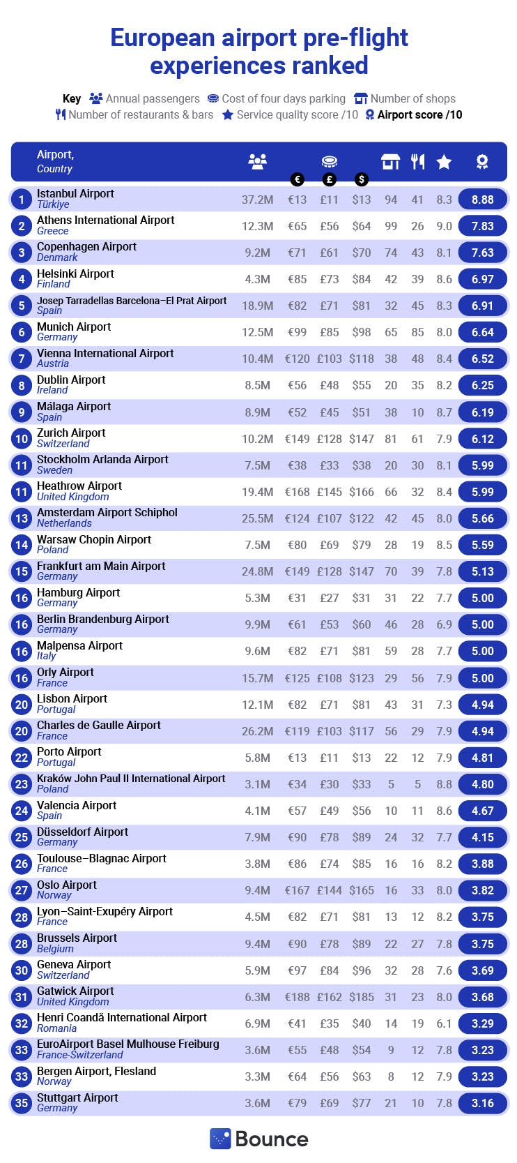 From the world-famous Heathrow to the great Amsterdam Schiphol, this report ranks the top 50 busiest airports in Europe on service quality, parking costs, shopping, and more, to reveal the airports with the perfect pre-flight experience for families, solo flyers, and business travelers alike.