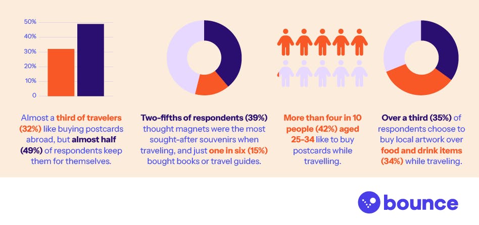 According to our survey, almost a third of travelers like buying postcards abroad, but almost half of respondents keep them for themselves. Even with all the tech available today, saving postcards is still popular, as they can be pinned up or framed, allowing you to capture special moments from your travels.