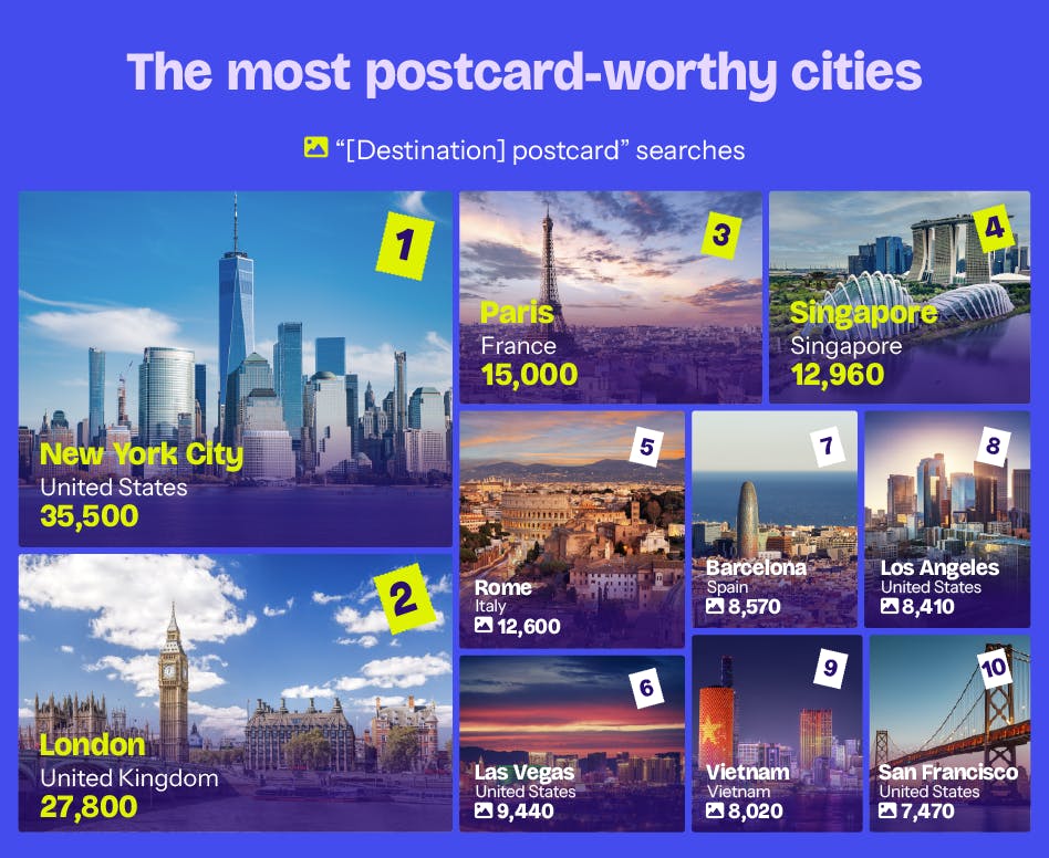 New York City stands out as the top destination for postcard searches, with 35,500 searches, highlighting the city's appeal as a must-see location for travelers around the globe.