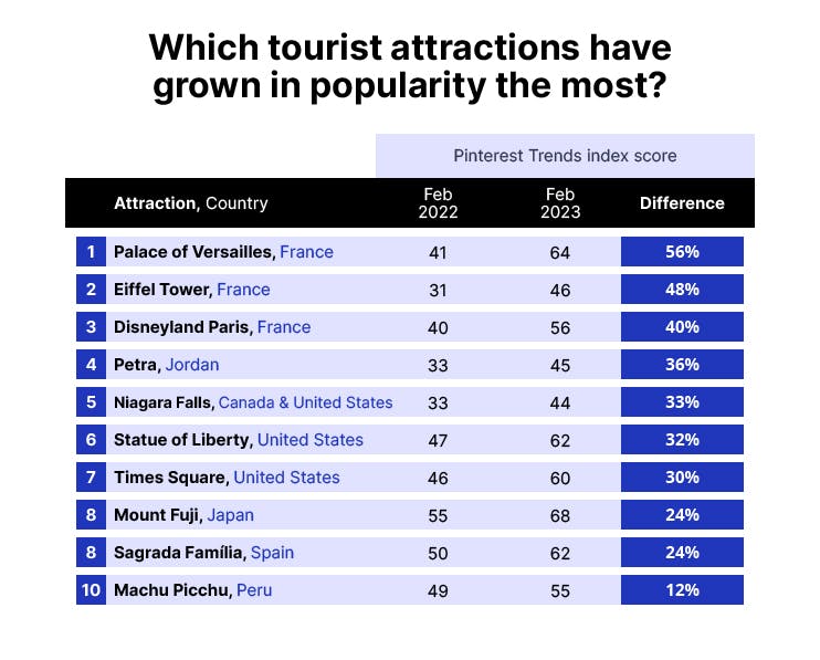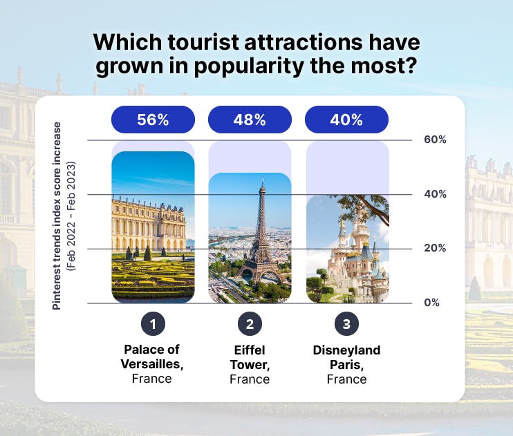 In second is another iconic French landmark, the Eiffel Tower, with a 48% increase in Pinterest searches.