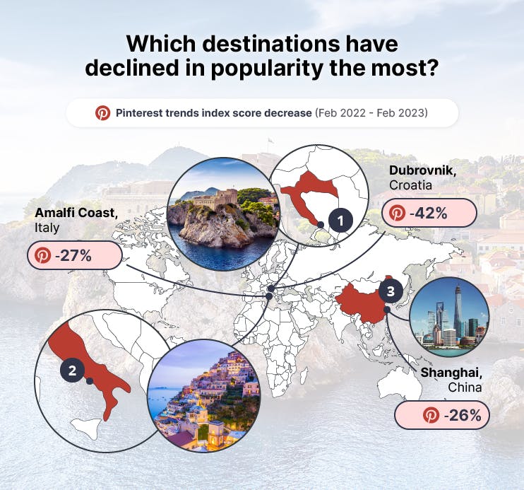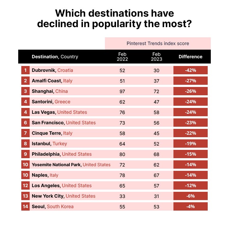 Perhaps this explains why its popularity on Pinterest has dropped by 42%, with travelers looking to avoid the crowds.