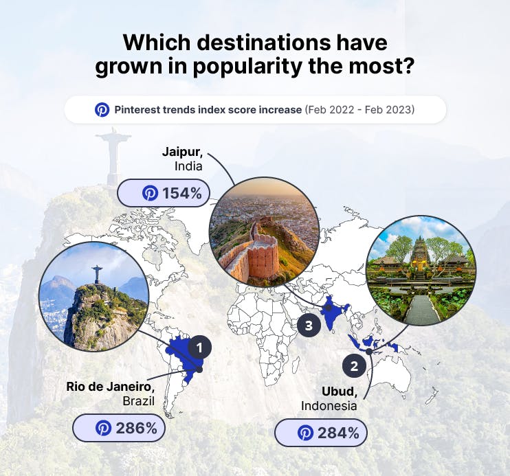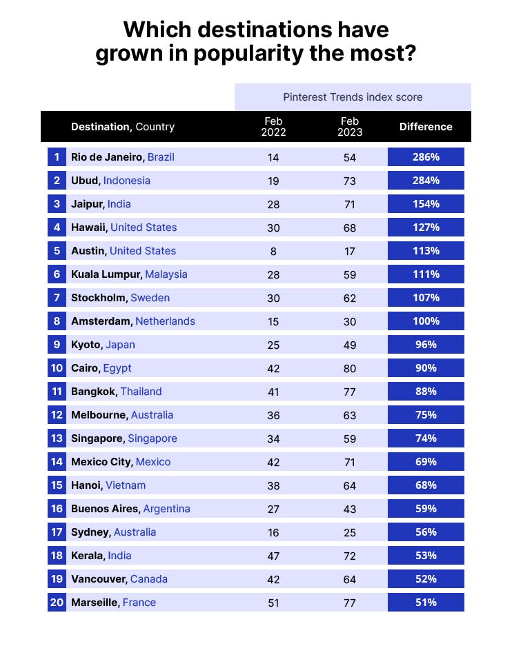 Taking first place is Rio de Janeiro, Brazil, which has seen its searches on Pinterest increase by an incredible 286% in the last twelve months.