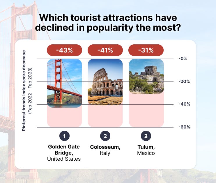 The attraction where searches on Pinterest have decreased the most is the Golden Gate Bridge, dropping by 43%. The Golden Gate Bridge is an iconic suspension bridge located in San Francisco, California, USA.