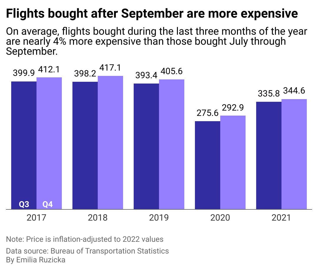 In fact, from 2017 to 2021, prices typically increased in the fourth quarter of the year compared to the third quarter. Prices are also inching their way back up to pre-pandemic prices over the past two years. Soaring flight prices aren't the only thing to be concerned about—Delta Airlines pilots recently voted to strike if unable to reach an agreement with the carrier. The potential strike wouldn't be immediate as the pilots must have permission first from the National Mediation Board. Still, it's enough to have nerves on edge and travelers wondering if other air carriers will follow suit.