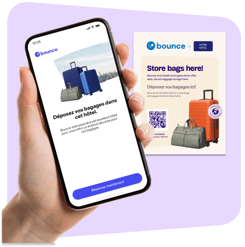 Bounce est le plus grand réseau de stockage de bagages au monde, avec des partenariats dans 4 000 villes et 100 pays, y compris avec des groupes hôteliers majeurs comme Ibis, Selina et Meininger. Approuvé par des millions d’utilisateurs, Bounce est l’entreprise de voyage à la croissance la plus rapide, ce qui ajoute crédibilité et fiabilité à votre hôtel.